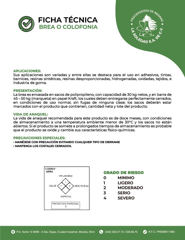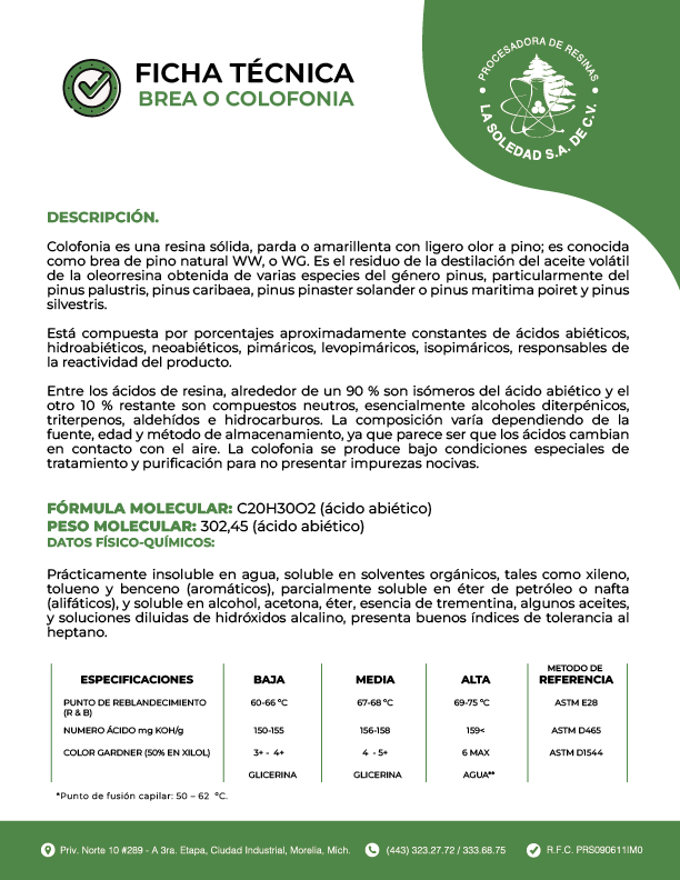 Colofonia es una resina sólida, parda o amarillenta con ligero olor a pino; es conocida como brea de pino natural WW, o WG. Es el residuo de la destilación del aceite volátil de la oleorresina obtenida de varias especies del género pinus, particularmente del pinus palustris, pinus caribaea, pinus pinaster solander o pinus maritima poiret y pinus silvestris.